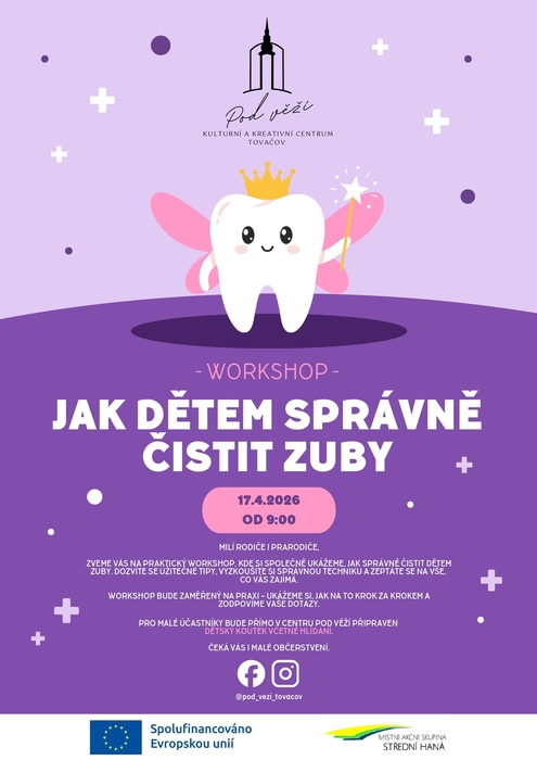 Kulturní a kreativní centrum Pod věží v Tovačově zve na praktický workshop Jak dětem správně čistit zuby, který se koná v pátek 17.4.2026 v 9 hodin.